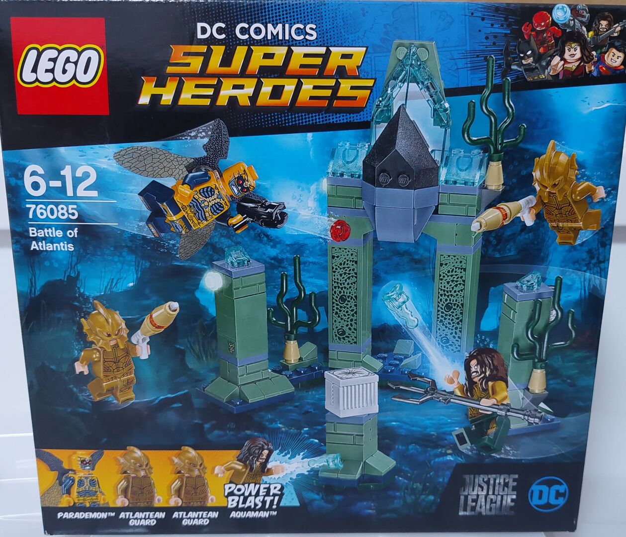 Dieses Set ist brandneu und wurde noch nie geöffnet. Die baubare Atlantis-Szene enthält einen großen Bogen, Parademons Super Jumper, die Mutter-Box auf einem Sockel, 2 Säulen mit Schilf-Elementen und Seegras-Elementen. Das Set enthält außerdem 4 Minifiguren: Aquaman (mit Rüstungsdekoration), ein Parademon und 2 atlantische Wächter. Das Waffenzubehör umfasst Aquamans 2 Power Blasts und den Dreizack, den Stud Shooter des Parademons und die atlantischen Plasmaguns der Wächter von Atlantis.