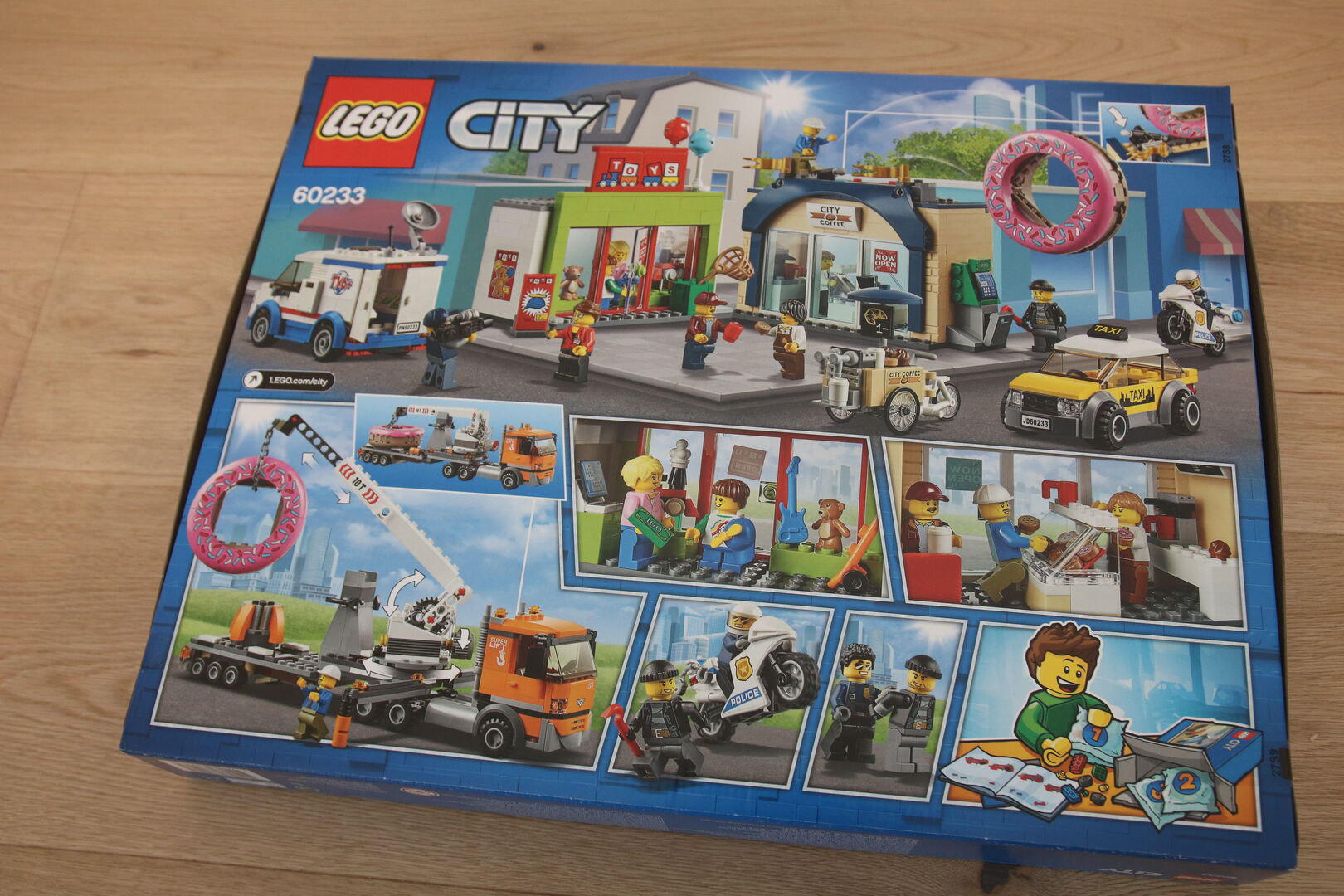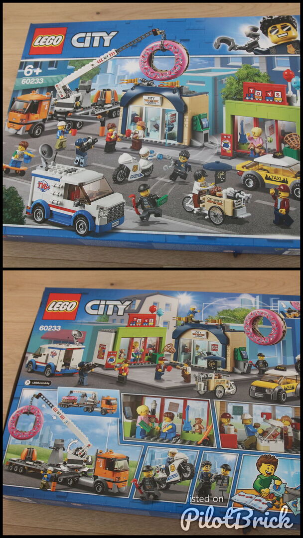 Das actiongeladene Set wurde von der animierten LEGO® City TV-Serie inspiriert und sorgt bei allen kleinen Stadtentdeckern für jede Menge Freude. Das coole Spielset „Große Donut-Shop-Eröffnung“ (60233) umfasst einen Lkw mit Krananhänger mit ausfahrbarem Kranausleger, Plattform und ausfahrbaren Stabilisatoren, einen Übertragungswagen mit Dach zum Öffnen und Satellitenschüssel, ein Taxi, ein Polizeimotorrad und ein Lastenfahrrad mit Kaffeeverkauf (neu ab Juni 2019). Dieses interessante Spielset enthält zudem ein Spielzeuggeschäft sowie einen Donut-Shop mit Geldautomaten und Freigabefunktion, um den riesigen Donut vom Dach des Gebäudes rollen zu lassen. Mit Instructions PLUS wird jedem LEGO Baumeister ein tolles Bauerlebnis geboten. Diese digitalen Bauanleitungen gibt es jetzt in der LEGO Life App für Smartphones und Tablets.  - Enthält 10 LEGO® City Minifiguren: den Polizisten Duke DeTain, einen Ganoven, den Besitzer des Spielzeuggeschäfts, 2 Baristas, einen Lkw-Fahrer, einen Reporter, einen Kameramann, einen Taxifahrer und ein Kind. - Dieses Konstruktionsspielzeug beinhaltet einen Donut-Shop mit Kaffeemaschine, aufklappbarer Tür, Freigabefunktion für den riesigen Donut auf dem Dach und einen Geldautomaten an der Seite sowie ein Spielzeuggeschäft mit Ballons und Regalen für Spielzeug. - Das detailreiche Spielset enthält außerdem einen Lkw mit Krananhänger mit einem Knopf, um den Kran anzuheben, und einem ausfahrbaren Kranausleger mit einer Kette, einer Plattform für den riesigen Donut und ausfahrbaren Stabilisatoren, ein Polizeimotorrad, ein Taxi mit abnehmbarem Dach, einen Übertragungswagen mit Dach zum Öffnen, Satellitenschüssel, TV-Bildschirmen und Produktionsausrüstung sowie ein Lastenfahrrad mit Schirm (neu ab Juni 2019). - Die Zubehörteile umfassen eine Propellermütze (neu ab Juni 2019), einen Teddybären, eine Spielzeug-Gitarre, ein Skateboard, eine Spielzeug-Eisenbahn, ein Fischernetz, eine Kamera, ein Mikrofon, ein Brecheisen, 5 Donuts, 5 Muffins, 4 Cookies, 1 Geldschein und 5 Kaffeetassen. - Drehe den Knopf, um den Kran zu bewegen und den riesigen Donut anzuheben, fahre dann den Ausleger aus, indem du daran ziehst, und befördere den Donut an seinen Bestimmungsort. - Wenn du auf den Auslöser auf dem Dach des Shops drückst, kannst du den riesigen Donut wegrollen lassen. - Über die LEGO® Life App können alle Baumeister auf die intuitiven Bauanleitungen von Instructions PLUS zugreifen. Damit können auch jüngere Baumeister an ihr Modell heranzoomen, es drehen und mithilfe des speziellen Geistermodus visualisieren. - Die LEGO® Life App kann im App Store oder bei Google Play heruntergeladen werden. Bitte deine Eltern um Erlaubnis, bevor du online gehst. - Mit diesem Spielset können Kinder spannende Szenen aus der animierten LEGO® City TV-Serie nachspielen. - Der Lkw mit Krananhänger ist 9 cm hoch, 28 cm lang und 7 cm breit. - Der Übertragungswagen ist 8 cm hoch, 11 cm lang und 6 cm breit. - Das Lastenfahrrad mit Kaffeeverkauf ist 6 cm hoch, 8 cm lang und 4 cm breit. - Das Taxi ist 5 cm hoch, 11 cm lang und 5 cm breit - Das Polizeimotorrad ist 3 cm hoch und 7 cm lang. - Der Donut-Shop ist 17 cm hoch, 14 cm breit und 6 cm tief. - Das Spielzeuggeschäft ist 13 cm hoch, 12 cm breit und 6 cm tief.